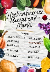 Egal ob Obst und Gemüse, Käse, Backwaren oder Wein – auf dem Hockenheimer Feierabendmarkt bieten zahlreiche regionale Anbieter ihr abwechslungsreiches Sortiment an. Der Hockenheimer Feierabendmarkt findet jeweils am zweiten und vierten Freitag des Monats auf dem Zehntscheunenplatz statt. Von 14:00 bis 18:00 Uhr kann hier eingekauft und geschlemmt werden. Der nächste Markt-Tag findet am 24. Oktober 2025 statt.