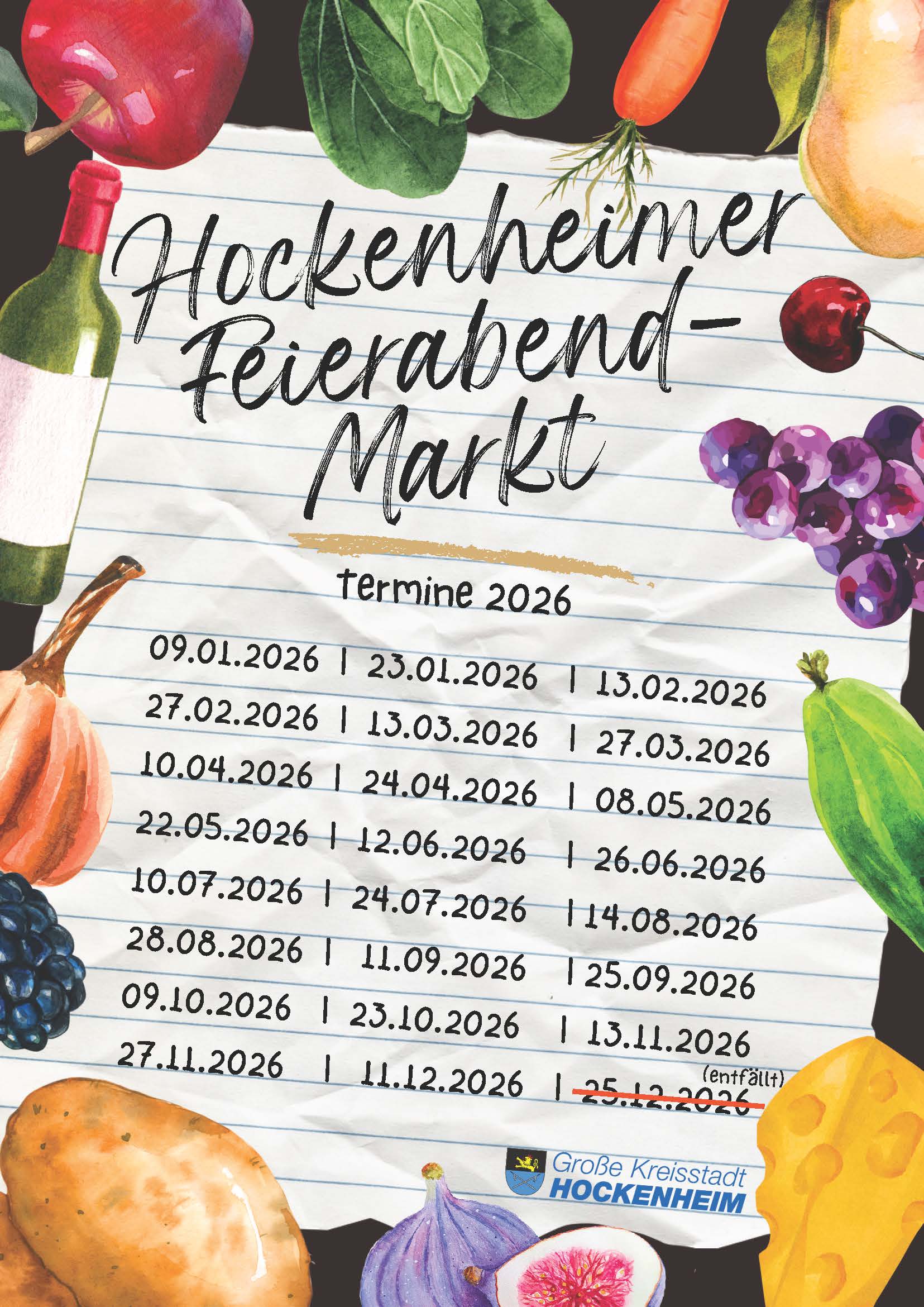 Egal ob Obst und Gemüse, Käse, Backwaren oder Wein – auf dem Hockenheimer Feierabendmarkt bieten zahlreiche regionale Anbieter ihr abwechslungsreiches Sortiment an. Der Hockenheimer Feierabendmarkt findet jeweils am zweiten und vierten Freitag des Monats auf dem Zehntscheunenplatz statt. Von 14:00 bis 18:00 Uhr kann hier eingekauft und geschlemmt werden. Der nächste Markt-Tag findet am 9. Januar 2026 statt.