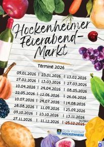 Egal ob Obst und Gemüse, Käse, Backwaren oder Wein – auf dem Hockenheimer Feierabendmarkt bieten zahlreiche regionale Anbieter ihr abwechslungsreiches Sortiment an. Der Hockenheimer Feierabendmarkt findet jeweils am zweiten und vierten Freitag des Monats auf dem Zehntscheunenplatz statt. Von 14:00 bis 18:00 Uhr kann hier eingekauft und geschlemmt werden. Der nächste Markt-Tag findet am 10. April 2026 statt.