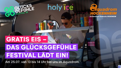 Am Nachmittag von 13 – 14 Uhr folgt dann der zweite Stopp: das Aquadrom Schwimmbad in Hockenheim. Hier wird es erfrischend kreativ: Die Eis-Sorten – ebenfalls bereitgestellt von unserem Partner Holy Ice – basieren auf den Geschmackskompositionen der GLÜCKSGEFÜHLE-Limonade, darunter auch Varianten mit einem Hauch Alkohol für Erwachsene. Natürlich ebenfalls kostenfrei.