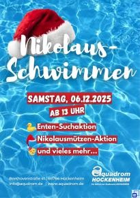 Am Samstag, den 6. Dezember 2025, öffnet das Aquadrom Hockenheim wieder seine Türen für einen abwechslungsreichen Nachmittag. Beim beliebten Nikolaus-Schwimmen erwartet Kinder und Familien ein vielseitiges Programm mit Spiel, Bewegung und kleinen Überraschungen im und am Wasser.